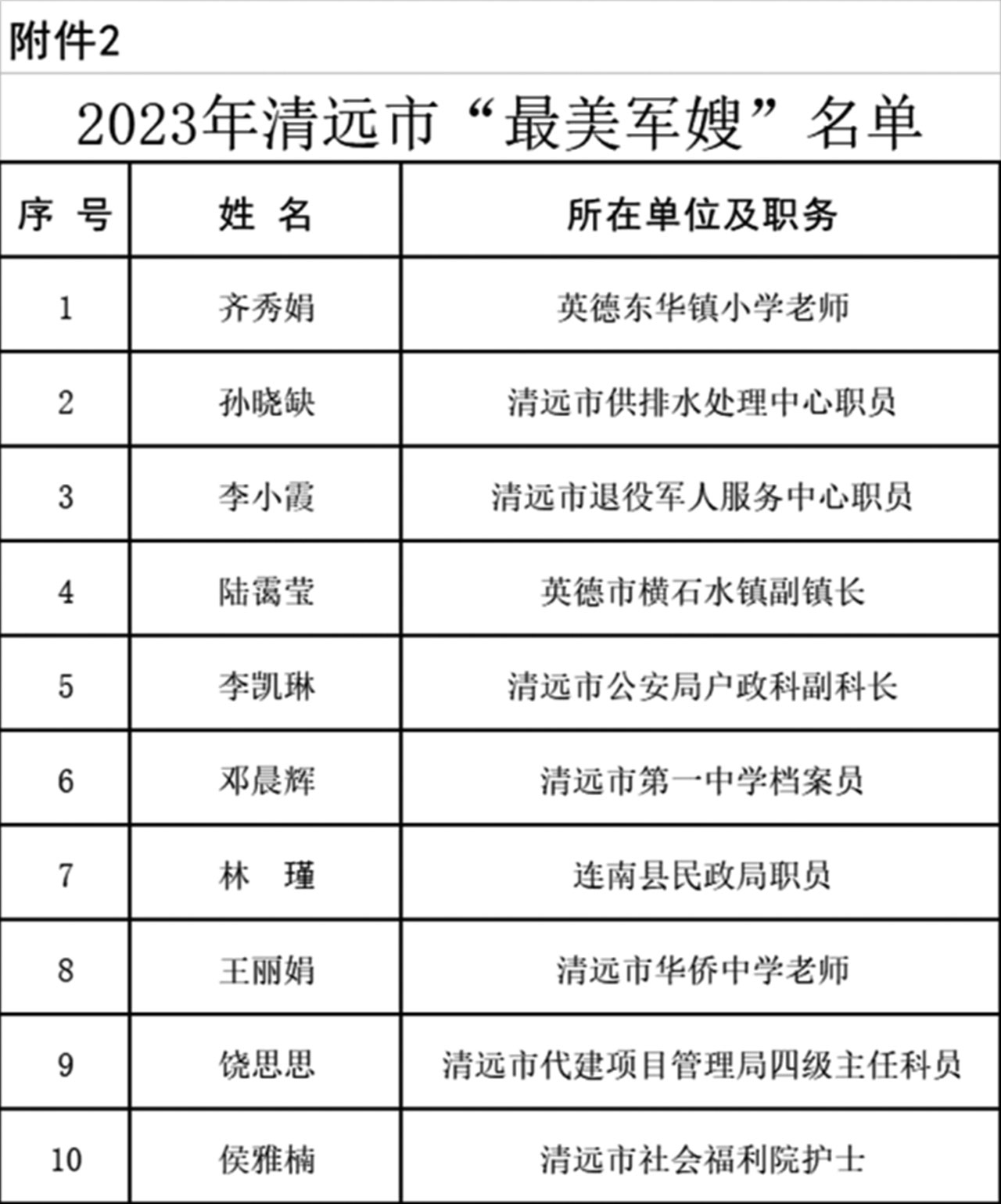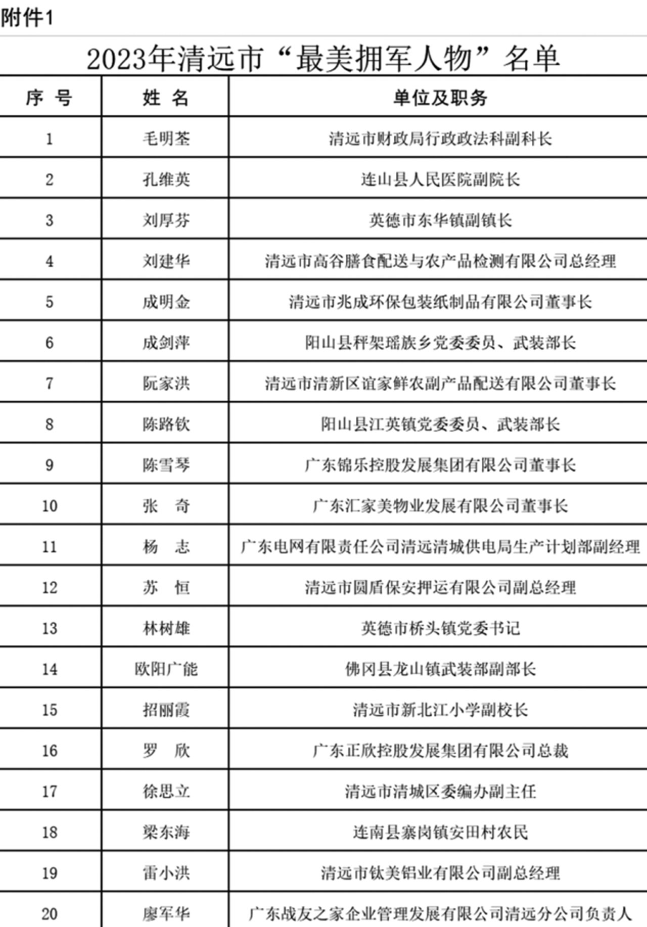 為激勵廣大干部群眾學(xué)習(xí)最美、爭當(dāng)最美,在全社會大力營造關(guān)心國防、尊崇軍人濃厚氛圍,營造立足崗位作貢獻(xiàn)、建功立業(yè)新時代的時代風(fēng)尚,清遠(yuǎn)市雙擁工作領(lǐng)導(dǎo)小組對毛明荃等20名“最美擁軍人物”、齊秀娟等10名“最美軍嫂”予以通報表揚(yáng)。
